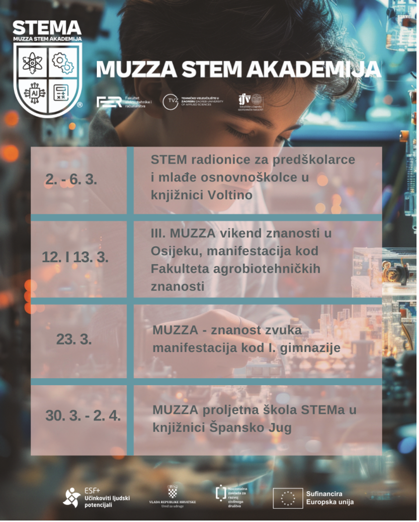 Udruga MUZZA tijekom ožujka donosi bogat program STEM radionica i javnih znanstvenih manifestacija namijenjenih djeci, mladima i široj javnosti u Zagrebu i Osijeku. Aktivnosti se provode u sklopu projekta MUZZA STEM akademija – STEMA, sufinanciranog iz Europskog socijalnog fonda plus, s ciljem popularizacije znanosti te razvoja znanja i vještina iz područja znanosti, tehnologije, inženjerstva i matematike.