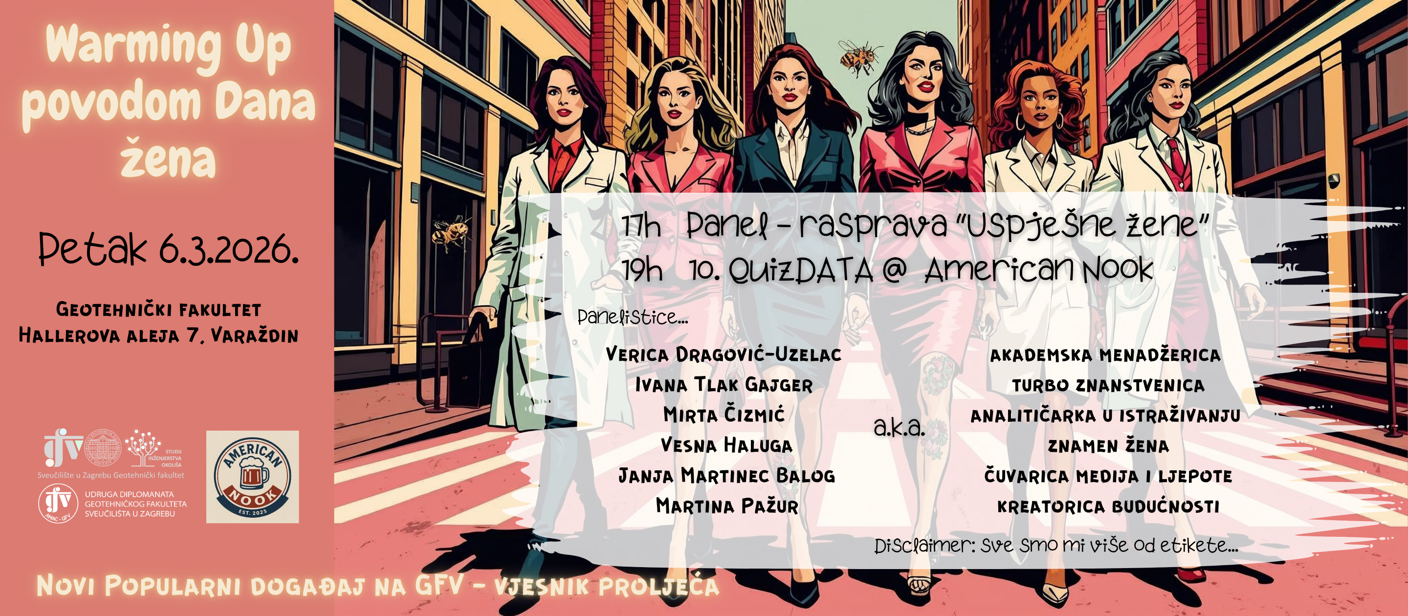 Program počinje u 17h panel-raspravom "Uspješne žene". Ovaj put promoviramo uspješne žene i njihove uloge u akademskoj i lokalnoj zajednici, struci i društvu: prof. dr. sc. Verica Dragović-Uzelac, dekanica (PBF), prof. dr. sc. Ivana Tlak Geiger (VEF), dr. sc. Mirta Čizmić (Selvita), dr. sc. Vesna Haluga (Grad Varaždin), Janja Martinec Balog (VTV) i Martina Pažur, ravnateljica (PPG VŽ)